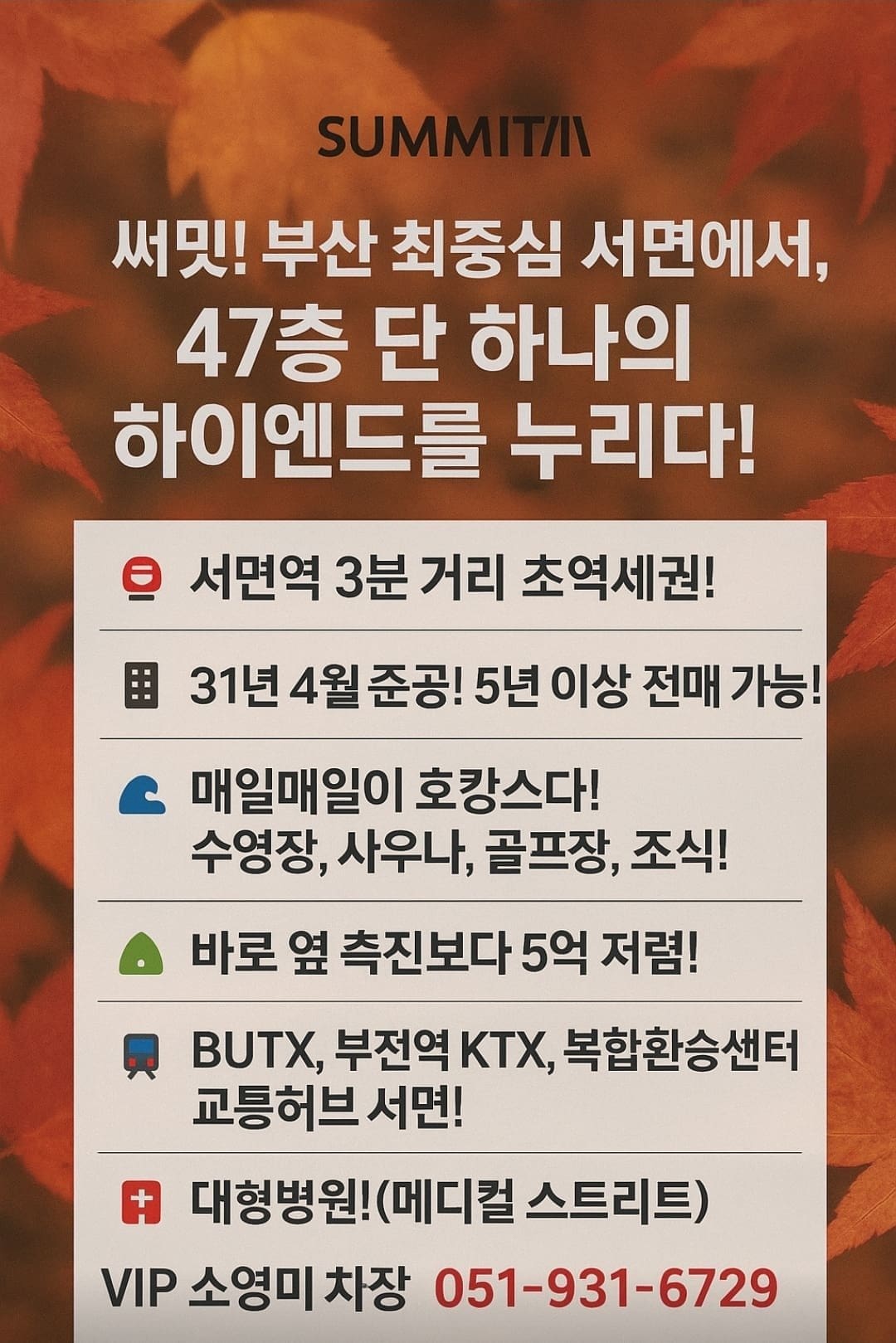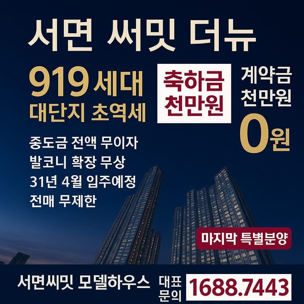 서면 써밋 더 뉴 부산 랜드마크를 가질 마지막기회! 계약금 천만원 (정액제)계약축하금 천만원~천오백만원 지급입주때까지 0원 더블 역세권 도보3분 1688-7443 3초만에 문의하기 Welcome To 서면 써밋 더뉴 919세대 대단지 쾌속 교통부터 편의 생활,청정 자연, 높은 비전까지생활을 위한 모든 가치와주거에 대한 바른 생각을 담은 곳 서면 써밋 더뉴84/122/131/136/147 평형에서 빛나는 내일을지금 만나보세요!대표번호 1688-7443 관심고객등록 타입면적 0 ㎡ PREMIUM 절대적 입지에 고품격가치를 더하다 TRAFFIC 역세권 [지하철 1, 2호선, 동해선 등 트리플 멀티역세권] NATURE 시민 공원 / 황령산 VIEW LIFE 수영장, 사우나, 골프연습장, 조식, 47층 스카이라운지 EDUCATION 초, 중, 고 학군메디컬 스트리트 서면 써밋 더뉴 특별 프로모션 진행 계약금 1천만원 BIG SCALE 세대수 0 세대 대지면적 0 ㎡ 타입면적 0 ㎡ 타입면적 0 ㎡ 타입면적 0 ㎡ 타입면적 0 ㎡ 타입면적 0 ㎡ OUR Information 부산시가 바라고 기대하는 생활과비전의 최중심을 누려보세요■ 서면최초 고품격 "어메니티" - 수영장,골프연습장,스카이 라운지 ,게스트하우스,휘트니스 클럽 - 역세권 [지하철 1·2호선, 동해선 등 트리플 멀티역세권] - 신축 대단지 [총 919세대 규모의 하이엔드 대단지 아파트] - 평지 입지 [서면 최중심에 위치한 생활 프리미엄] - 초등학교 [전포초 도보 3분, 동성초 등 다수의 우수 교육시설 인접] ☞ 브·역·대·신·평·초, 모두를 갖춘 부산 중심 OUR VISION 서면 써밋 더뉴에입주하는 새로운 방법! 자격제한 無 집이 있어도 OK! 만19세 이상 누구나 OK! 청약제한 無 청약절차/청약통장 X 초고층 하이엔드 브랜드 전매제한 無 전매 가능 중도금 전액 무이자 Contact Us 방문예약 상담신청1688-7443 로얄층문의 잔여세대문의 위치안내 문의하실 부분이 있으시면 내용을 남겨주세요.빠른 시일 내에 연락 드리겠습니다. 이 양식을 작성하려면 브라우저에서 JavaScript를 활성화하십시오.이 양식을 작성하려면 브라우저에서 JavaScript를 활성화하십시오.성함 연락처 방문인원 및 연락처방문인원개인정보 수집 및 이용 동의 *개인정보 수집 및 이용 동의제출